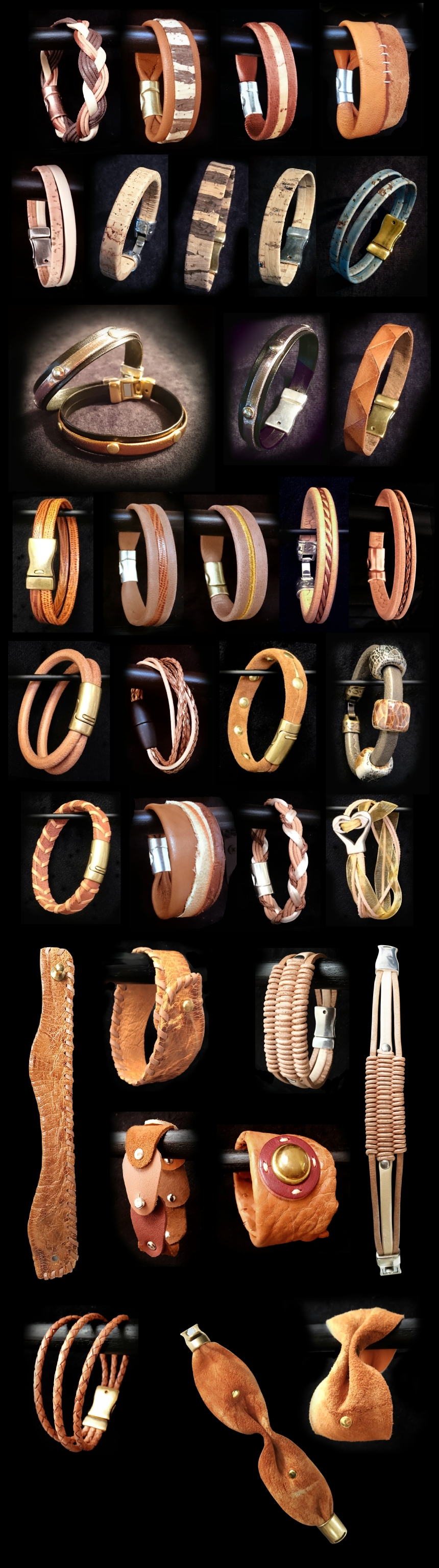 Bracelets en cuirs de chèvre, vachette, agneau, autruche, liège.